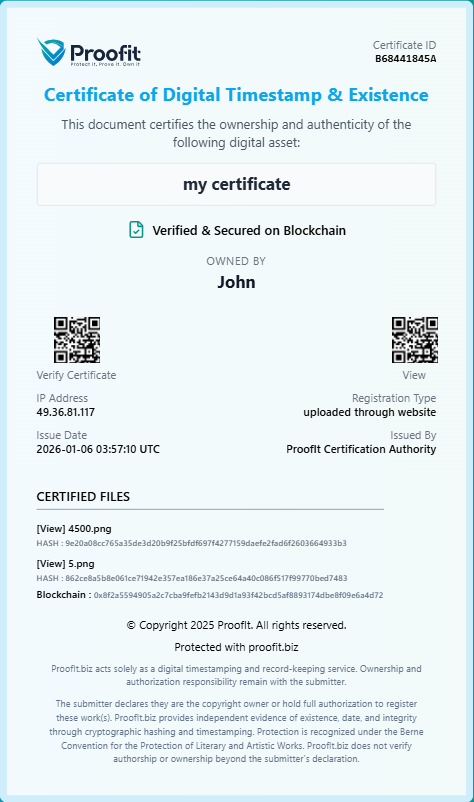 Protect your ideas, designs, code, and creations with blockchain certification. ProofIt makes originality undeniable anytime, anywhere.